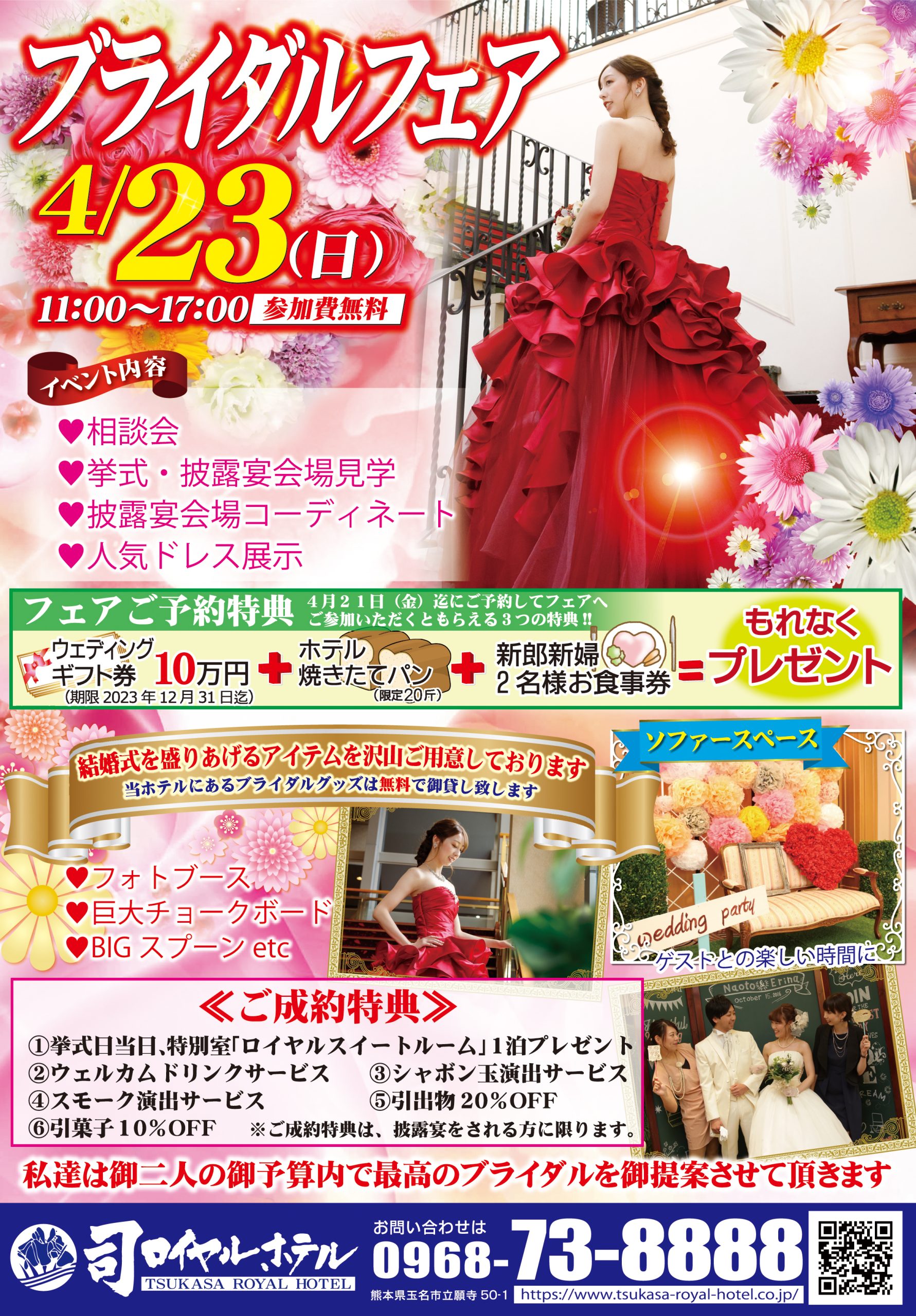 2023/02/20 お知らせ 2月19日(日)ブライダルフェアにお越しいただき、ありがとうございました。次回のブライダルフェアは4月23日(日)に開催予定となっております。【挙式・披露宴】をご予定・ご興味のあるお客様は、入場無料ですのでご遠慮なくお越し下さい。