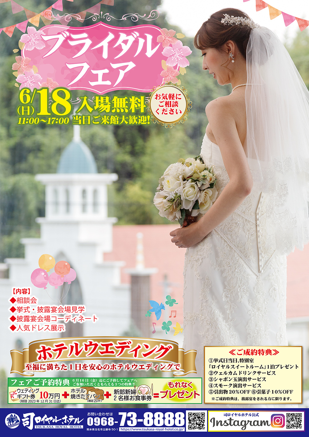 2023/06/17 お知らせ 明日6月18日(日)2階桜桃の間にてブライダルフェアを開催いたします。 ご相談だけでも大丈夫です!そのほか、挙式・披露宴会場見学や披露宴会場のコディネート、人気ドレスの展示などご準備いたしております。入場は無料です。お気軽にお越しください。スタッフ一同心よりお待ちいたしております。