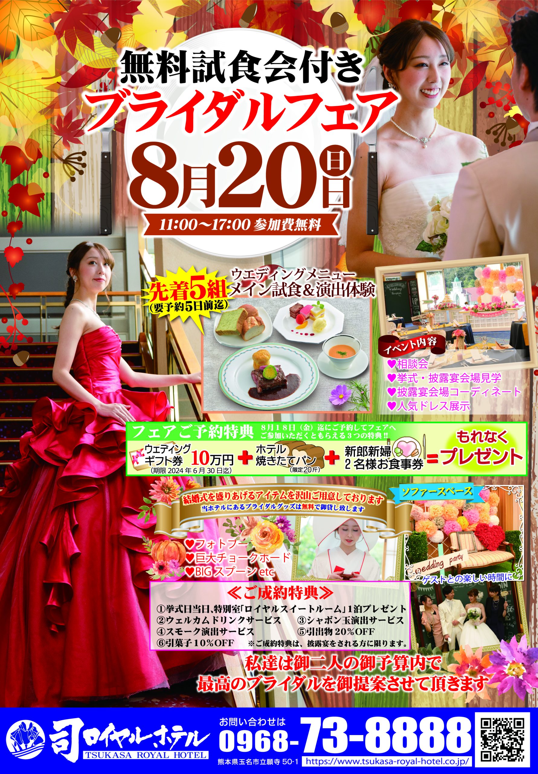 2023/06/21 お知らせ 先日のブライダルフェアに於いて、沢山のご予約を賜りました。心より御礼申し上げます。次回のフェアは8月20日(日)11時~17時に開催予定です。ご要望が多い試食会と演出体験を先着5組様(要予約)に行います。その他フェア特典も多数ご準備いたしております。ご遠慮なくお問い合わせください。 ◆試食会のご予約は 0968-73-8888 ◆予約なしでもご興味のあるお客様は、当日入場無料ですのでご遠慮なくお越しください。