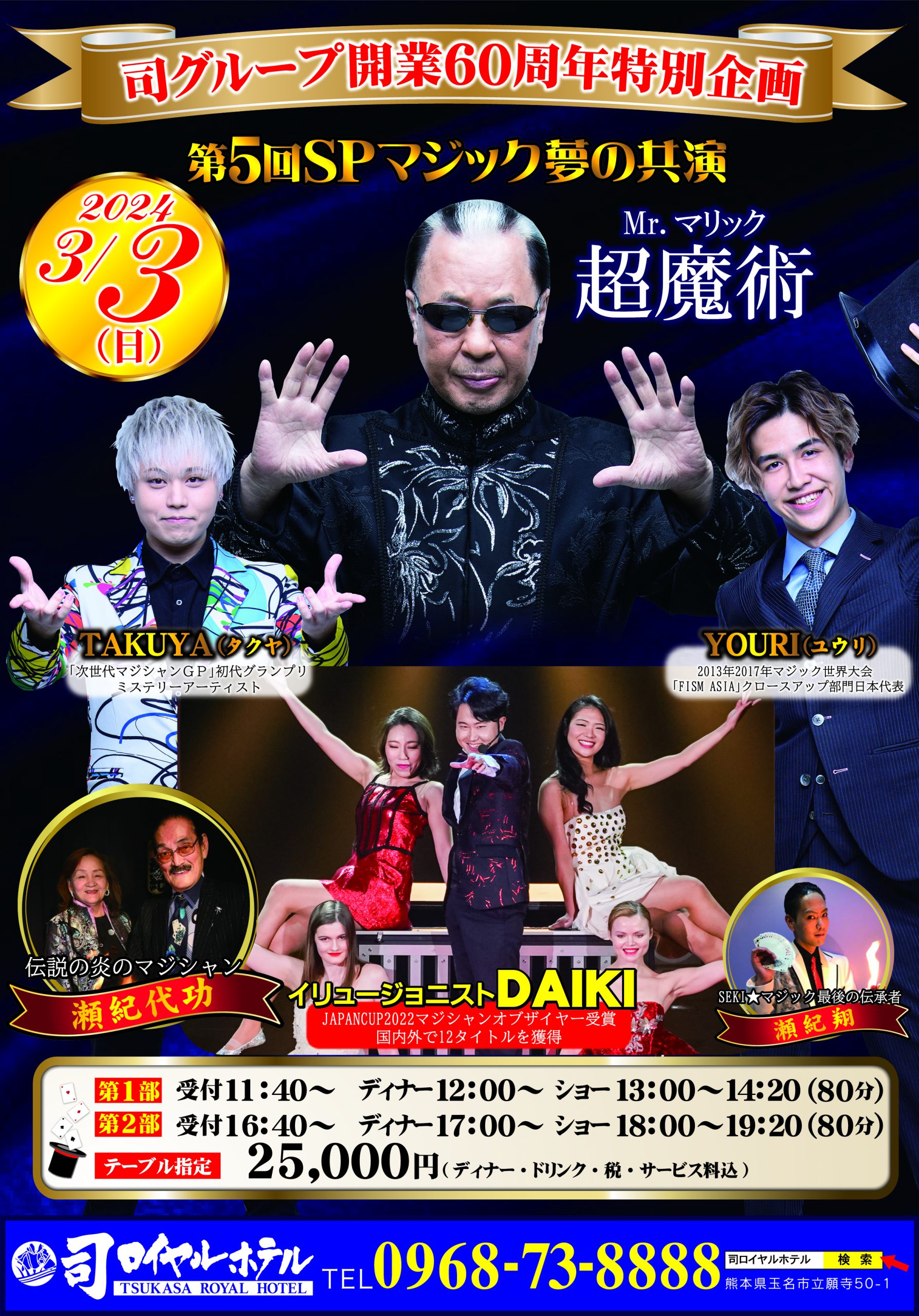 第5回『SPマジック夢の共演』 4年ぶりの超魔術【Mr.マリック】さんを初め、TVで活躍中の YOURI(ユウリ)・TAKUYA(タクヤ)のお二人も前回に引き続きご来館!!そして遂に世界で活躍されているイリュージョニスト【DAIKI】さんが登場されます!! その他、伝説の炎のマジシャン【瀬紀代功】さんとSEKI☆マジック最後の伝承者【瀬紀 翔】によるクロースマジックも皆様の目の前で披露されます。きっと凄いマジックショーになると確信致しております。チケットの販売開始は、1月15日(月)から行います。 お問合せは、司ロイヤルホテル 0968-73-8888までお願い申し上げます。