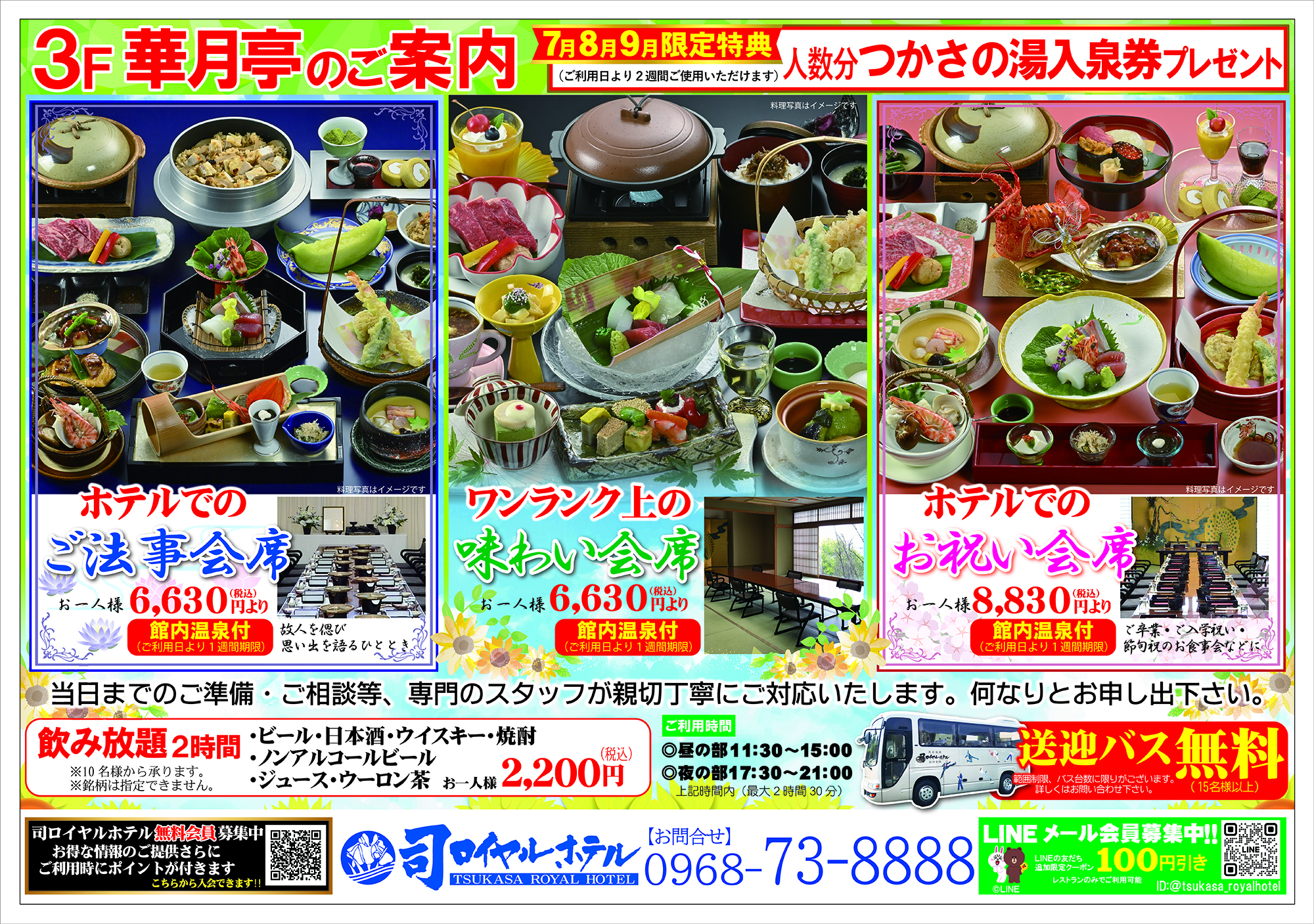 2025/06/30 お知らせ 7月8月9月に3階華月亭ご利用のお客様には人数分のつかさの湯入泉券をプレゼントいたします。 ホテルでのご法事会席・ワンランク上の味わい会席やお祝い会席など各種宴会予約承り中です。 当日までのご準備・ご相談等、専門のスタッフが親切丁寧にご対応いたします。 何なりとお申し出ください。 また、15名様以上で送迎バスが無料となっております。 台数に限りがございますので、お早目のご予約お待ちいたしております。