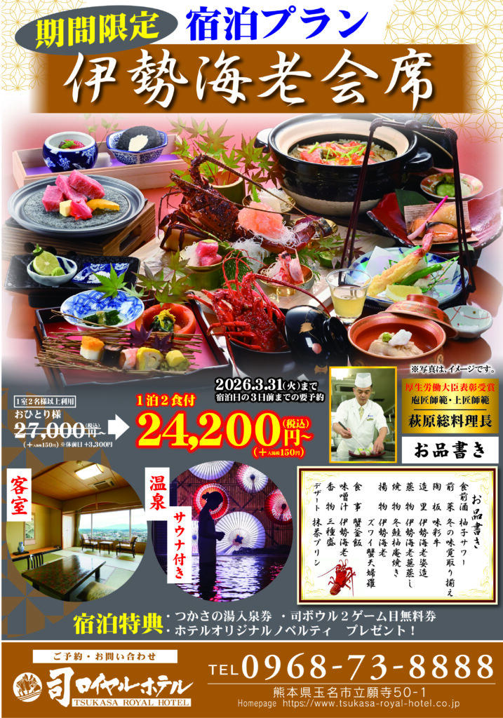 2026/01/20 お知らせ 伊勢海老会席宿泊プランのご案内です。 大人4名様からのご利用となります。心行くまでご堪能ください。[期間] 2026年3月31日(火)まで ※宿泊日の3日前までの要予約[料金] 1室2名様以上利用お一人様27,000円(税込)+入湯税150円 ※休館日+3,300円のところ1泊2食付き24,200円(税込)+(入湯税150円)詳しくは画像をご覧ください。 お問い合わせ、ご予約は0968-73-8888までお願い致します。