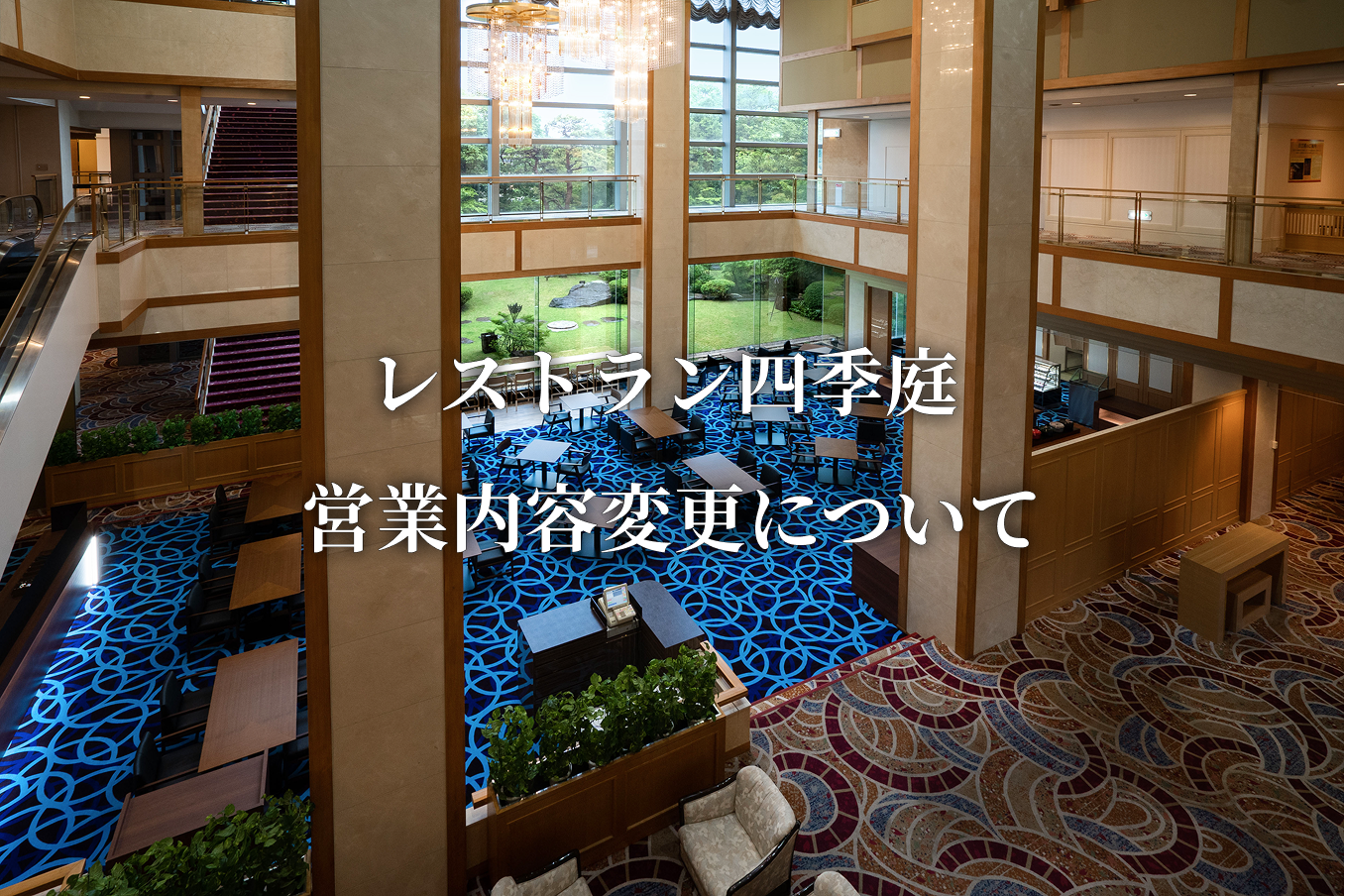 2026/03/18 お知らせ レストラン四季庭は、令和8年4月1より営業内容が変更になります。外来のお客様へのランチ・ディナーのご提供は行っておりません。ご宿泊のお客様の朝食・夕食専用となります。 ◆通常の営業は喫茶コーナー11:30~20:00 ◆特別ランチイベント営業予定日・ゴールデンウィークバイキング5月2日(土) / 3日(日) / 4日(月) / 5日(火)・8月のお盆バイキング(日程未定)・年末年始バイキング(日程未定)