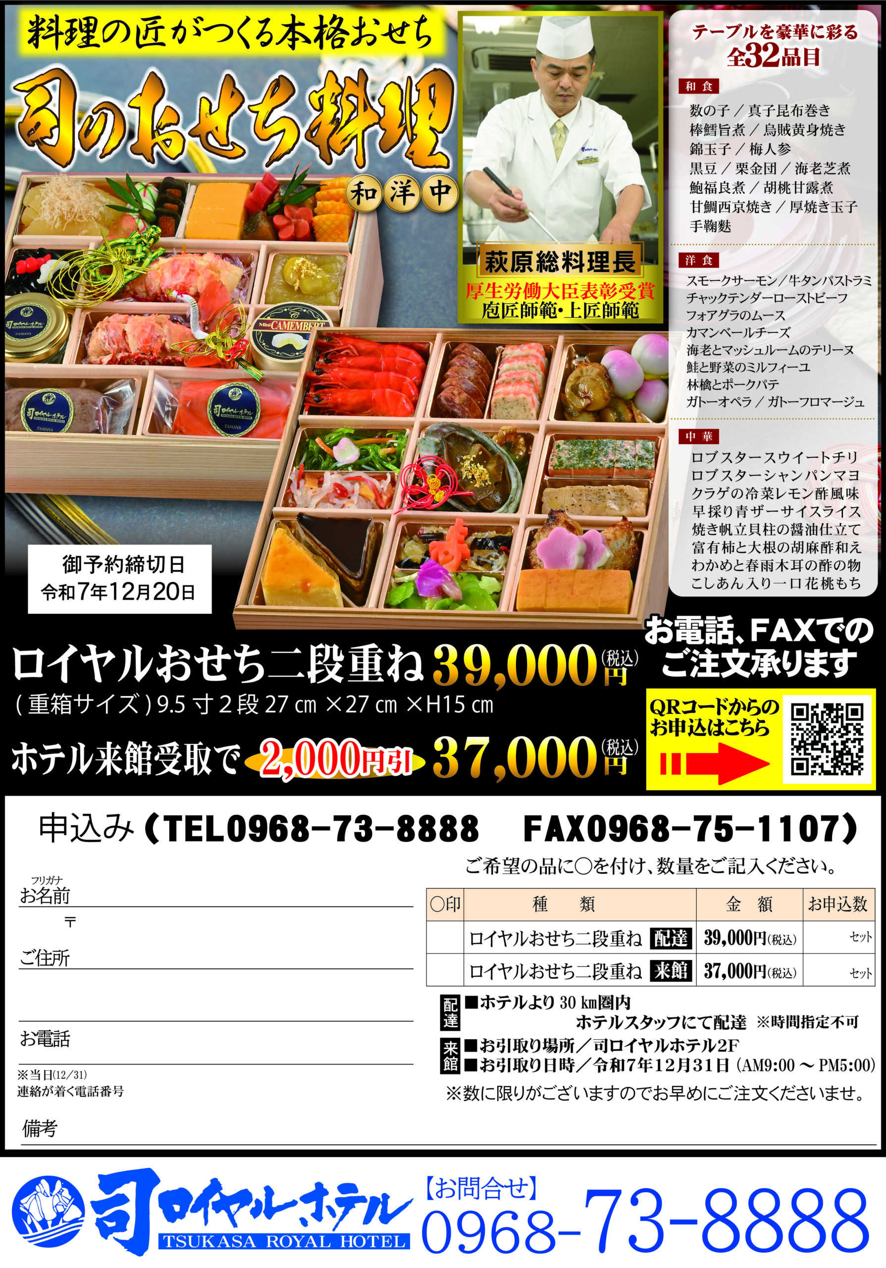 2025/10/06 お知らせ お申し込みはこちら 初春を慶ぶ年の初めにぜひ、司ロイヤルホテル和・洋・中のおせち料理の販売を10月6日より販売受付致します。ロイヤル「おせち料理」をぜひご堪能ください。 ご予約はお電話、FAXでのご注文も承っております。 ご来館での受け取りですと二千円割引でございます。 心よりご予約をお待ち申し上げます。 お申し込みはこちら
